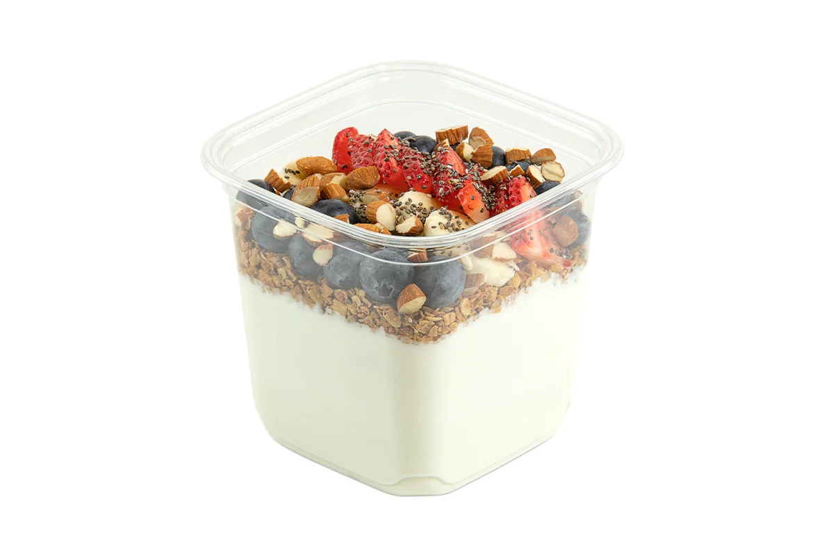 Vanilla Greek Yogurt • Granola • Blueberries • Banana • Chia • Almonds • Strawberries